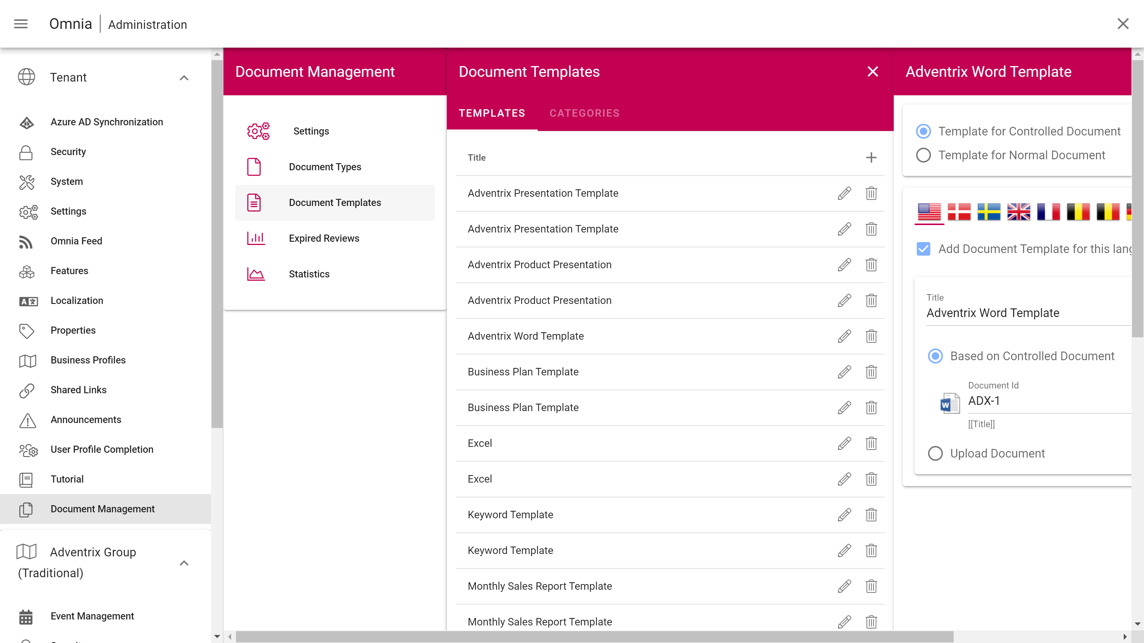 Med Omnia får du möjlighet att skapa ett centralt bibliotek av officiella dokumentmallar som sedan kan göras tillgängliga för användare. Istället för att användare skapar egna mallar kan ni säkerställa en kvalitetssäkrad hantering för såväl globala som lokala mallar. Självklart finns det stöd för att hantera mallar på olika språk med till exempel godkännande och versionshantering.